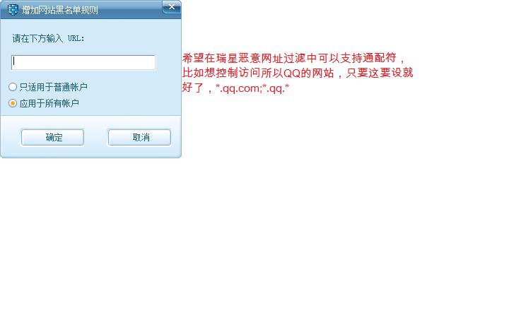 你好,能不能在瑞星恶意网址过滤中可以支持通配符,比如想控制访问所以QQ的网站,只要这要设就好了,*.qq.com;*.qq.* 这样可以减少许多设置项目。请看附件,