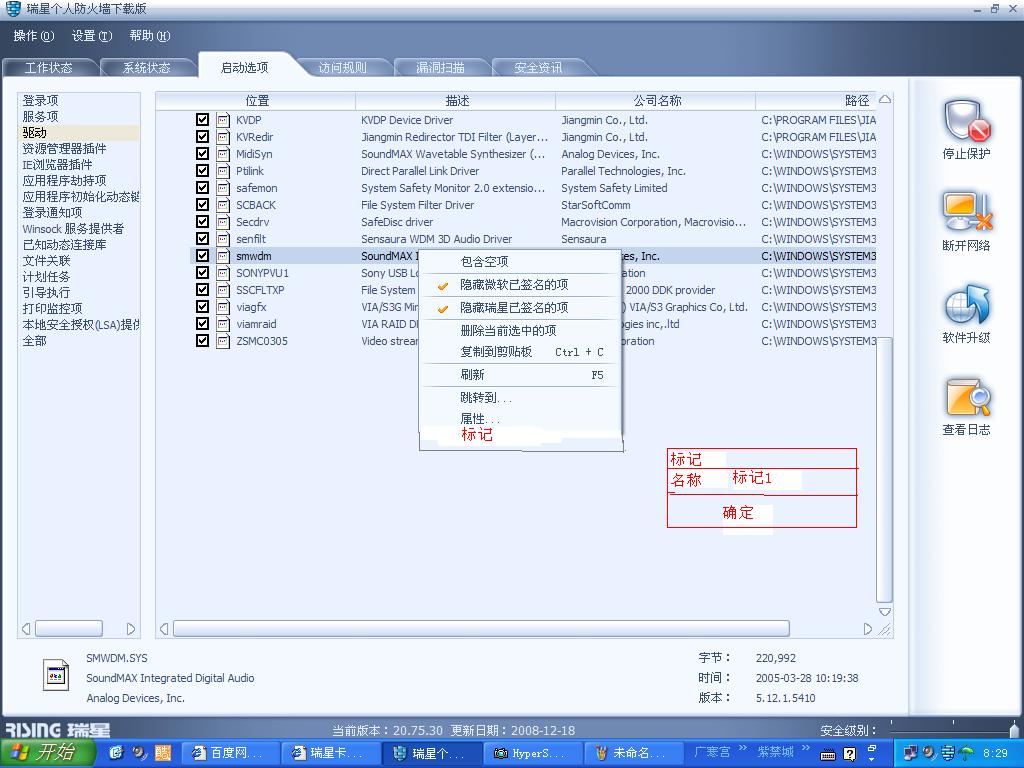 我是希望增加标记功能和隐藏标记功能。比如你隐藏了微软签名和瑞星签名后余下的你作个标记命名为标记1或者其他名字。再能右键选隐藏标记1。这样有新增加的进程,启动项,驱动,服务等你不是很容易发现吗?这主要是为了手工杀毒用的。事实上查看进程,启动项等不就是为了手工杀毒用的嘛。如果全交给杀毒软件,那还要查看进程,启动项这些功能干什么?我这里只是为了使查看进程,启动项,驱动等更方便,更好用。