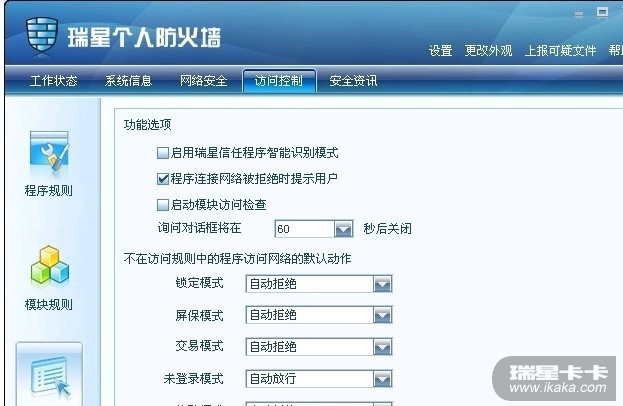 如图,请勾选“启用瑞星信任程序智能识别模式“,通过云安全认证的程序在访问网络时会自动放过。