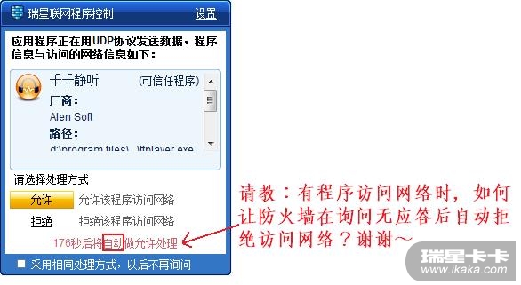 回复: 瑞星弹出提示窗口倒计时完了后如何让其自动拒绝访问网络?