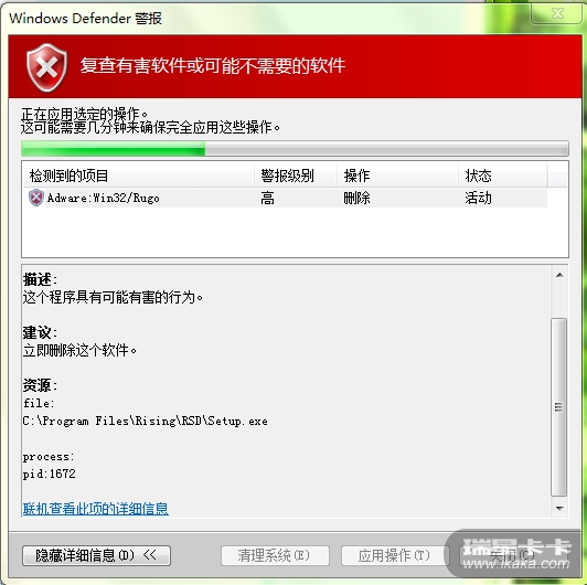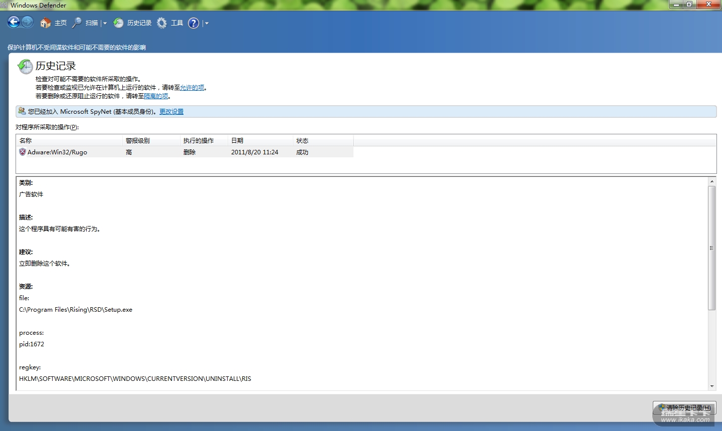 今天windows defender弹出警告,说有一个可能有威胁的程序,然后我点击了清除,之后看详细信息发现是瑞星文件夹里边的东西,不知道是不是瑞星的文件,上图。
