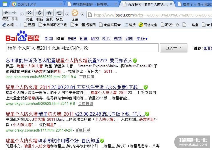 瑞星个人防火墙2011版本 23.00.23.29恶意网址防护搜索引擎结果风险提示图标未显示!怎么办?只能显示金山图标,