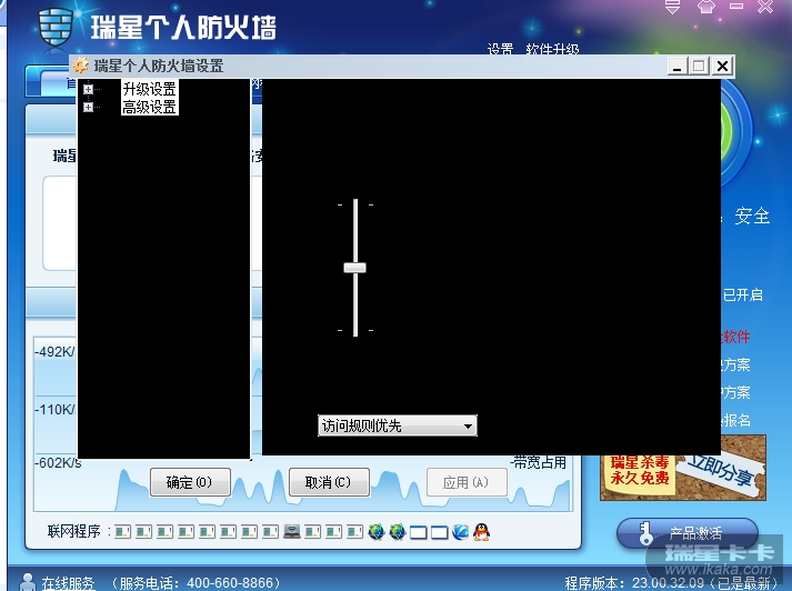 我的瑞星防火墙一点设置就会卡住,把设置页面关掉,就好了,但是这不能设置防火墙很愁人啊,我修复过防火墙可是没有用