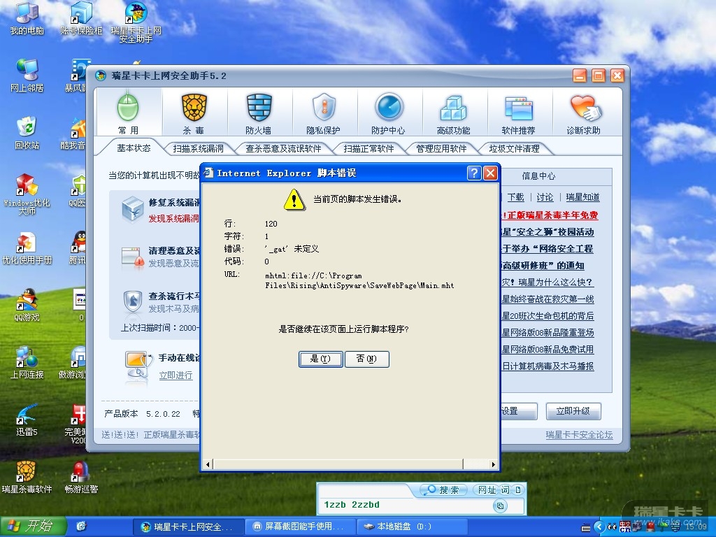启动电脑首次运行卡卡点垃圾文件清理出现脚本错误。关闭后,再运行则没有出现。