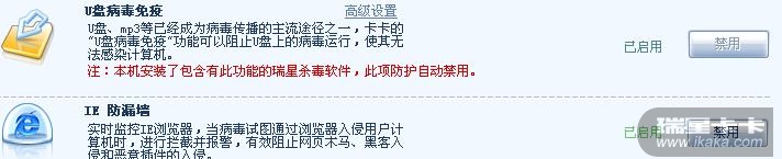 右下角我的IE防漏墙保护功能自动暂停了,但在卡卡助手上显示的是打开状态,只是字体颜色与其它“已启用”相比更艳一些。