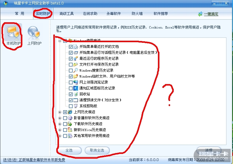 点击常用——随便点一个菜单(图片点了电脑痕迹清理)——点实时防护——界面仍然是电脑痕迹清理的界面