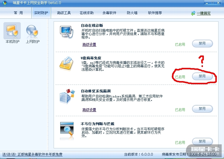 卡卡6中的u盘免疫较之前版本的u盘免疫有所增强,是一个独立的功能,安装了杀毒软件也可启用,这是正常的。