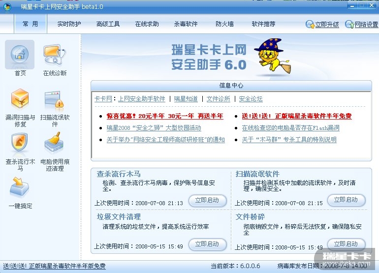 这几天刚刚使用了卡卡6.0版,发现确实比5.0版的版面更清晰、菜单更多了,比360卫士要强多了,还没有出现系统被攻击破坏的现象。现把第一次的BUG进行反馈: