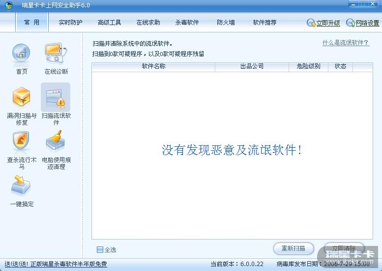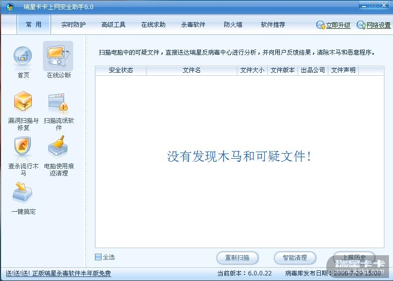 其实我对安全软件特别感兴趣,像恶意软件清理助手啦,金山清理专家啦,瑞星卡卡啦,360啦,windows清理助手啦我都有,下面来看一看它们的实力吧!首先我用卡卡对系统进行了一次恶意软件+木马扫描+在线诊断,结果如下: