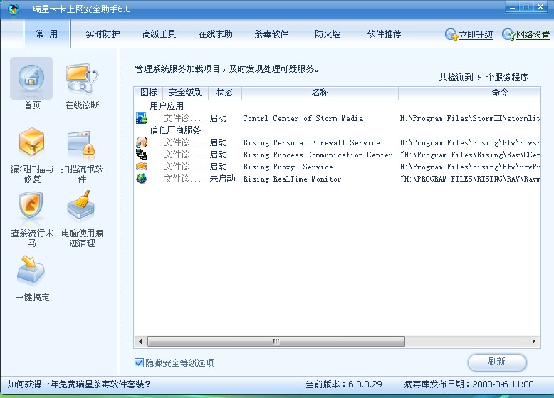 卡卡6.0怎么不知道瑞星杀软和卡卡自己的服务是否安全呢?