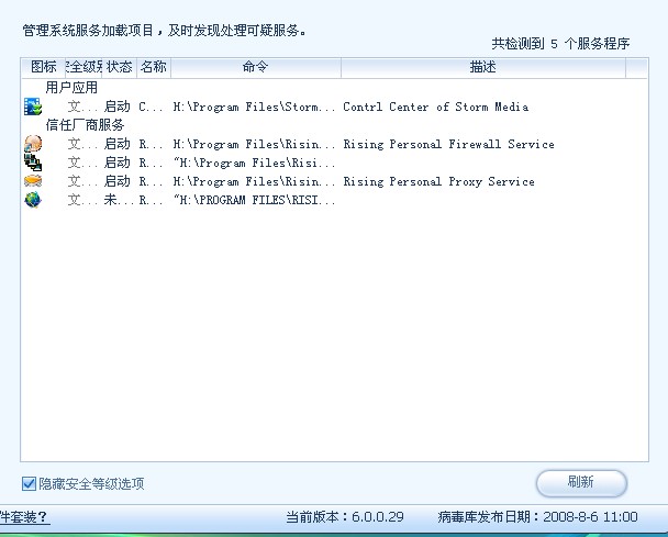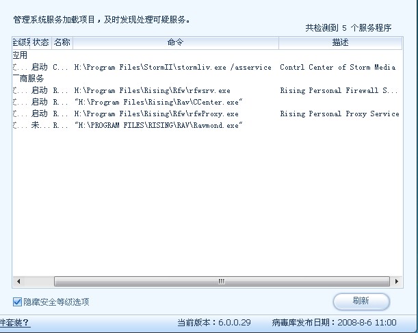 今天,真是有点搞笑,我重新安装卡卡6.0,并且升级到最新版本,检查”服务管理“项时,发现卡卡6.0发现了5个服务项属于“不安全项”,因为我设定了自动隐藏安全项,那么不被隐藏的不就是不安全的项吗?