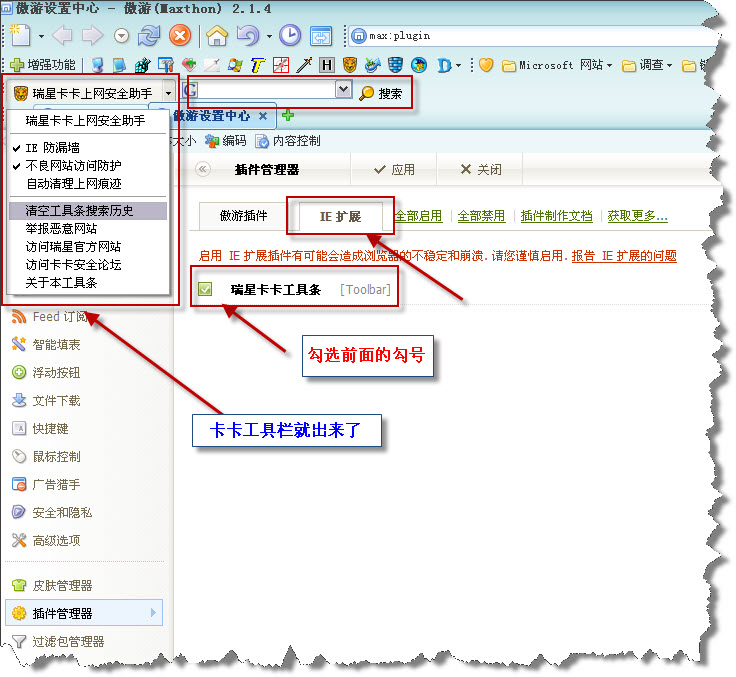 卡卡工具条在遨游2浏览器怎么显示出来?