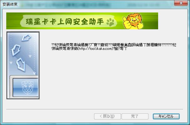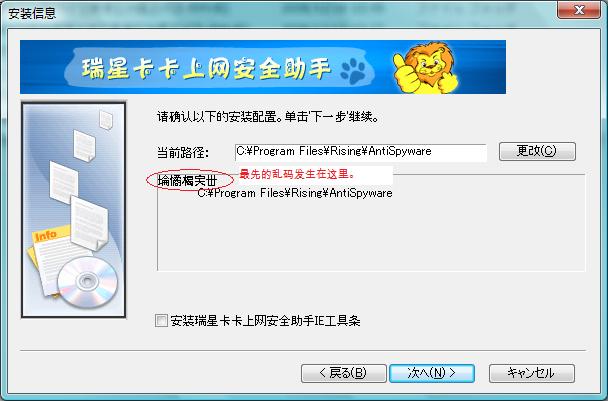 本人使用日文系统WindowsVista。在瑞星升级到2009后,遵循瑞星全功能安全软件2009的推荐,下载了KaKaSetupv6.exe进行安装,结果安装画面出现乱码,被强制结束,无法正常安装。请教瑞星专家这个问题如何解决?