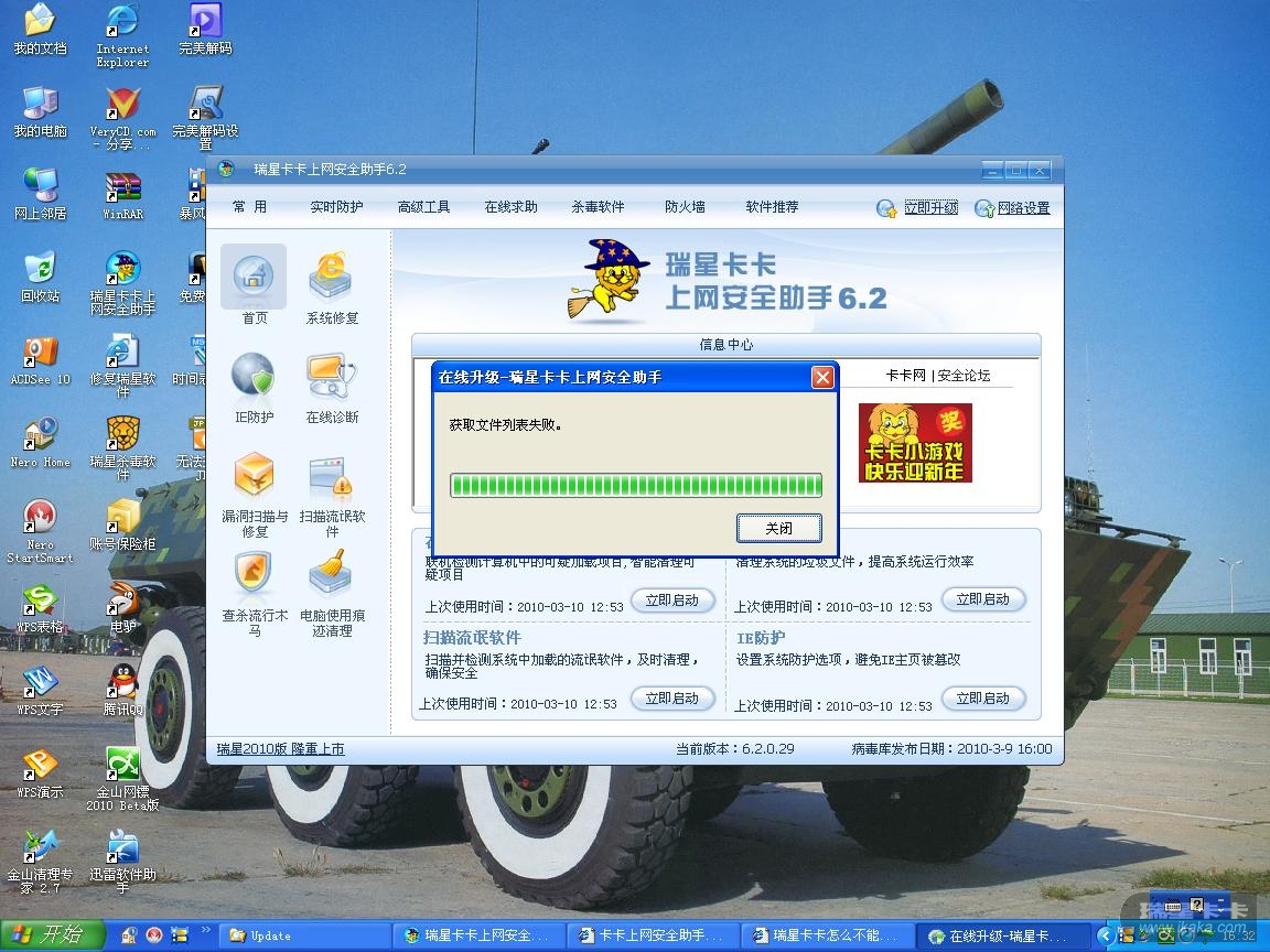 今早升级卡卡时还成功了一回,然后后面打开就如附件所示,正常应该是出现:本地是最新版本的提示。但我这里不是无法升级就是获取地址失败的提示。这是啥问题啊?我的卡卡是正版的6.2.0.29,病毒库是2010-3-9号16;00点的。好容易好了几个月,现在卡卡又出问题了,劳烦版主看看,谢谢
