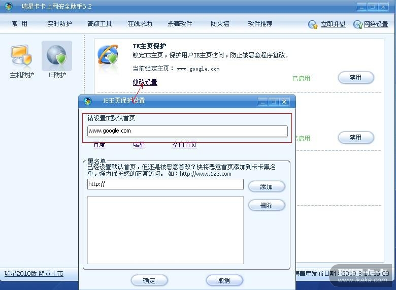 楼主可以再卡卡上网安全助手的IE防护中(如下图)