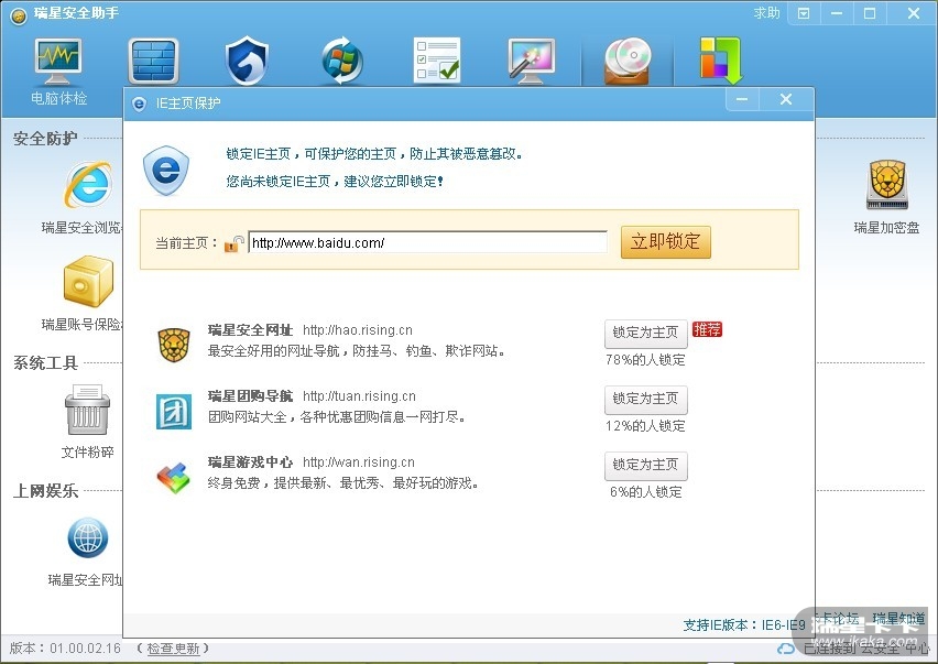瑞星安全助手功能大全中,打开IE主页保护,在这里设置锁定主页。如下图: