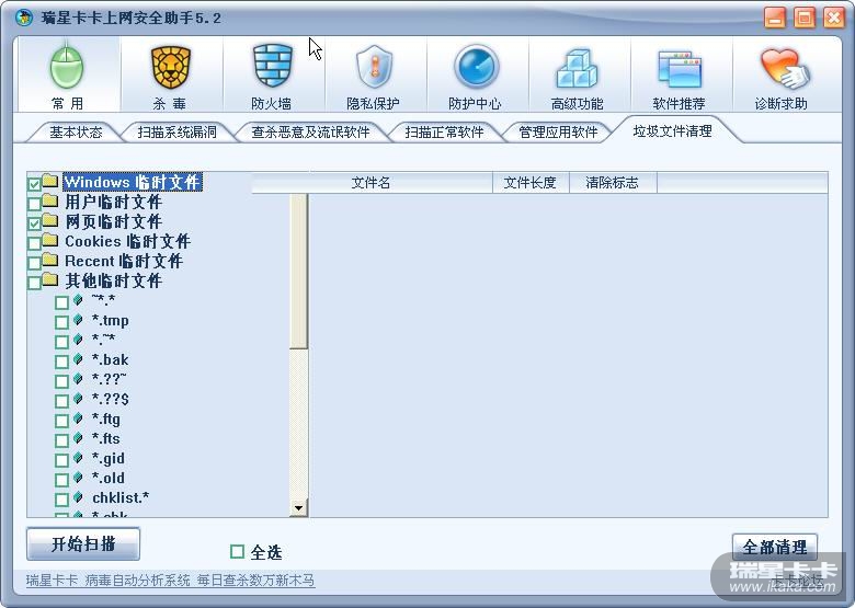 使用方法:当您打开瑞星卡卡上网安全助手主界面,待自动扫描完成后点击『垃圾文件清理』按钮即可使用。在此您可以选择清理多种类型的系统垃圾文件,也可以全选,点击“开始扫描”即可轻松扫描系统内的垃圾,扫描完毕单击“全部清理”即可清理所有扫描到的垃圾文件。