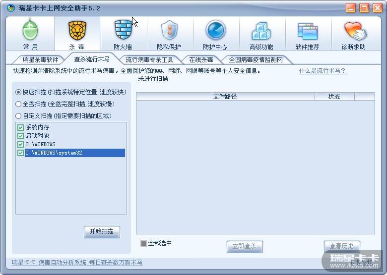 使用方法:当您打开上网安全助手,在『杀毒』标签下的功能页面的『查杀流行木马』下即可使用。您可以选择快速扫描、全盘扫描或者自定义扫描。
