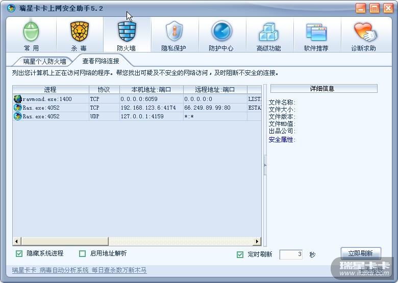 当你连接网络的时候,是否觉得某些连接比较可疑。卡卡上网安全助手5查看网络连接功能可以让危险连接无所遁形。还提供可疑网络连接上报、评xxx能。(注:如果您的评论是某文件的第一条,您的评论将显示卡卡软件客户端上,供5000万卡卡上网安全助手用户参考。 )