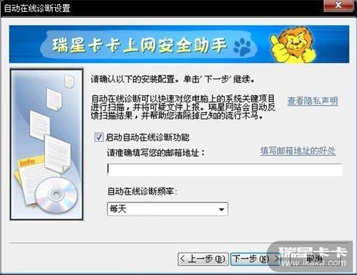 瑞星卡卡上网安全助手的安装过程很简单,您只需连续单击“下一步”即可完成安装,注意:默认的安装路径是在C盘,您可自行修改安装路径,当安装到如图所示的自动在线诊断设置时,如果你想启动自动在线诊断功能,那么就必须填写您的邮箱地址,否则只有取消安装该功能才能继续安装进程。
