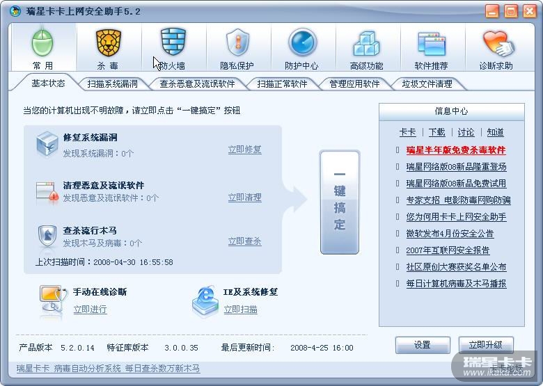 最轻松的操作,最安全的效果:卡卡上网安全助手5中隆重推出一键搞定功能,让用户轻松修复系统漏洞、清除恶意流氓软件、查杀流行木马三种功能一键搞定。只需一次点击就可以快速清除掉系统中存在的木马、恶意及流氓软件,并对操作系统中存在的漏洞进行修补。