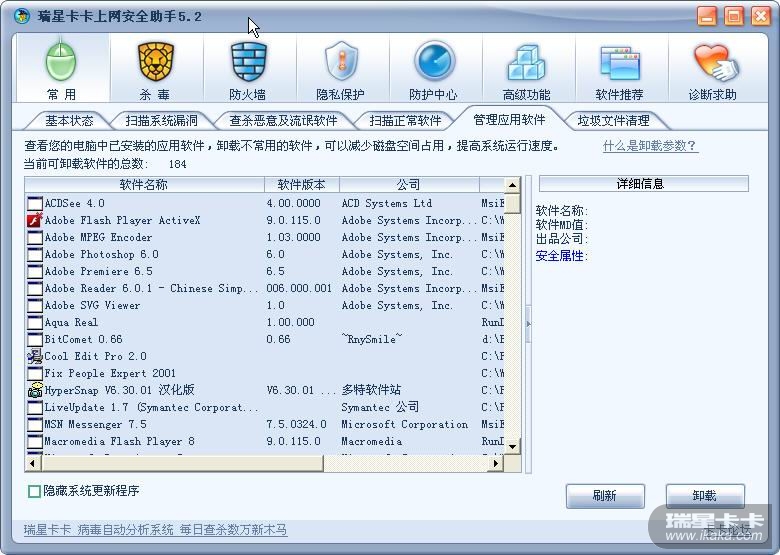 使用方法:当您打开瑞星卡卡上网安全助手主界面,待自动扫描完成后点击『管理应用软件』按钮即可使用。您可以在此查看软件的详细信息,可以查看网友对该软件的评论,可以卸载该软件。