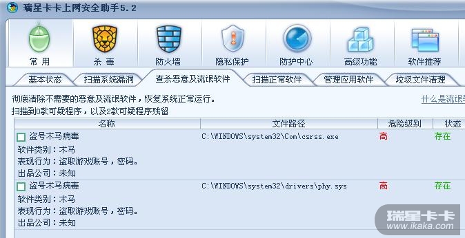 请问卡卡检测到盗号木马病毒是否误报?csrss.exe和phy.sys