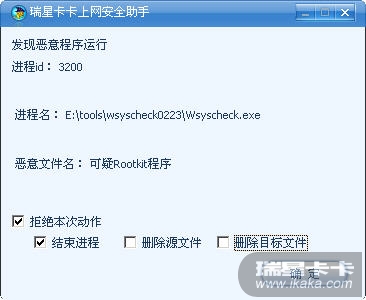 第一次运行Wsyscheck,卡卡弹窗(如图1)提示“发现恶意程序运行”,恶意文件名“可疑rootkit程序”,可能是因为Wsyscheck释放驱动吧,然后我把“删除源文件”和“删除目标文件”去掉,点“确定”,ok,一切正常,Wsyscheck没有运行起来,被卡卡拦住了。