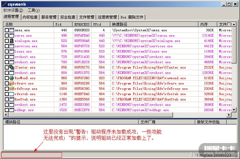 紧接着我第二次运行Wsyscheck,卡卡没有任何提示,Wsyscheck正常运行了,而且释放的驱动已经正常加载,Wsyscheck的所有功能都可以正常使用。