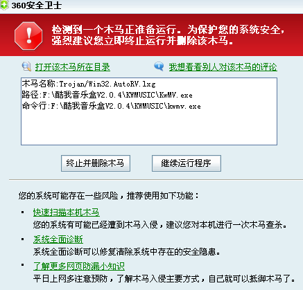 今天晚上,我电脑里的360安全卫士升级后,当我打开“酷我音乐盒”就发现了一个问题,这个问题就是:360竟然把“酷我音乐盒”当木马病毒来杀了。 起先我还以为有木马入侵了“酷我音乐盒”,所以我就把“酷我音乐盒”删除了,然后去官网重新下了一个,当我安装后重新进入后又显示“酷我音乐盒”是木马,我当时和奇怪,这个怎么会是木马,所以我大胆的忽略掉这个所谓的“木马”进入了“酷我音乐盒”,当我进入后我就搞懂为什么360把“酷我音乐盒”当木马查杀了,原来“酷我音乐盒”里面有瑞星的广告,我感觉正是因为这个广告害了“酷我音乐盒”,因为瑞星和360最近阶段水火不容,而“酷我音乐盒”偏偏又取消了和360的合作改而和瑞星合作了,360就立马把“酷我音乐盒”xxx,把它当木马病毒来杀!  从这个事情里我可以看出:360是多么的无耻,就算人家“酷我音乐盒”和瑞星合作而不和你合作了,你也不应该把不是属于木马病毒的“酷我音乐盒”当木马来杀吧? 以前网上还经常说360是怎么怎么的言而无信,怎么怎么的无耻,我都不怎么相信。 亲身经历了这件事情后我才知道了。原来360真的很言而无信,真的很无耻。 晚些时候我去把360删除了,以后就单方面用我自己的正版瑞星了,再次鄙视下360.