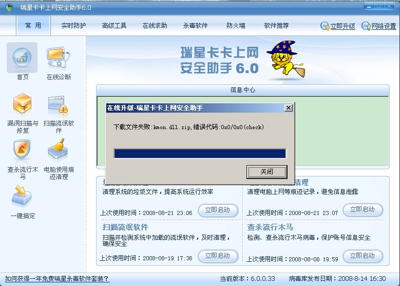 每次我点击“立即升级”,在下载了一部分组件后,总会弹出如下对话框(请看截图),不管试好多次都这样,请问各位大虾该如何解决?