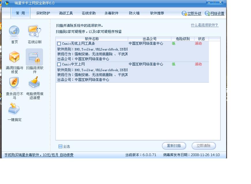 。这个卡卡比360强,注册表残留被发现了。卡卡加油啊,一流氓转行了做警 察就比老警 察牛了?另外想问问卡卡和瑞星杀毒附带的漏洞扫描怎么提示没有漏洞,360提示漏洞有两个而且提供了补丁呢?这两个补丁是:kb950582;kb958752。非要逼着用360?不用不行?