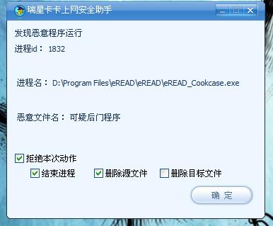 这是一款电子书软件eREAD的一个文件,有时因为卡卡的这个提示程序会完全打不开,一定是误报。在解决问题之前,有没有办法能阻止卡卡的这个提示?