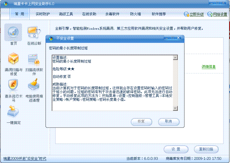 此项无法进行自动修复,手动修复此项的方法为:开始菜单->设置->控制面板->管理工具->本地安全策略->帐户策略->密码策略->密码长度最小值。