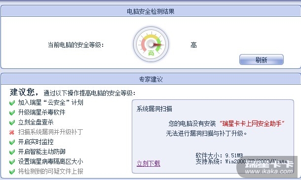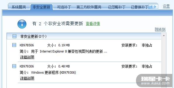 可惜啊!现在不安装卡卡,瑞星提示安全级别为中级,提示我安装卡卡扫描系统漏洞,可是每次扫描都提示有两个非安全更新,选择修复,然后提示修复成功,然而再次扫描还是提示有两个非安全更新,郁闷了!结果一看他的补丁编号和下载地址才发现,原来他检测的是Windows7以前版本操作系统的漏洞!