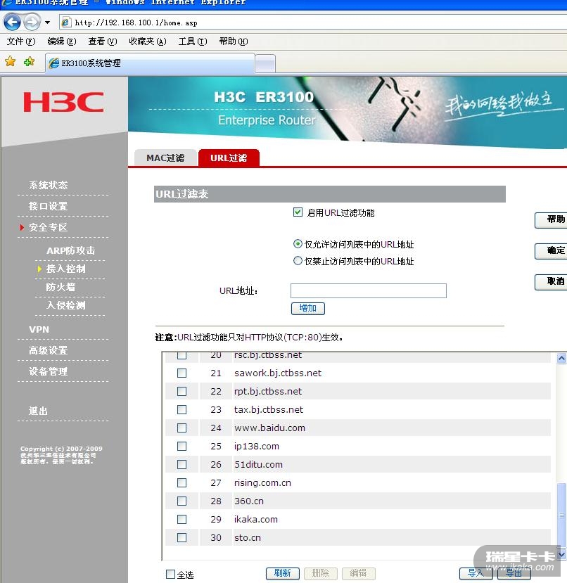 如图:本人在路由上做了URL安全策略,只允许访问列表里的网址。这样一来卡卡助手和瑞星的部分功能无法使用(列如:更新文件,漏洞修复,提示找不到服务器),请问我还需要往URL表里添加那些网址才能让瑞星和卡卡使用全部功能。谢谢!!!!