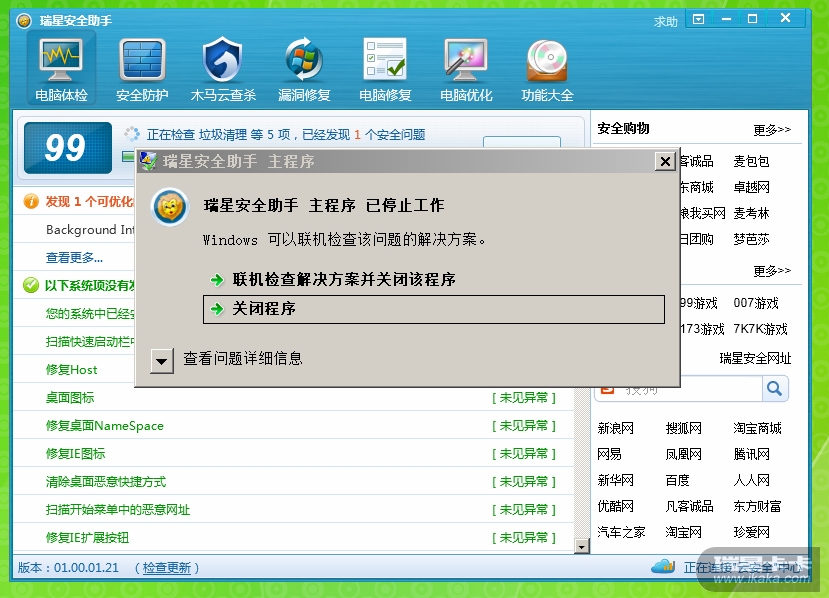 回复: 瑞星安全助手 主程序 已停止工作