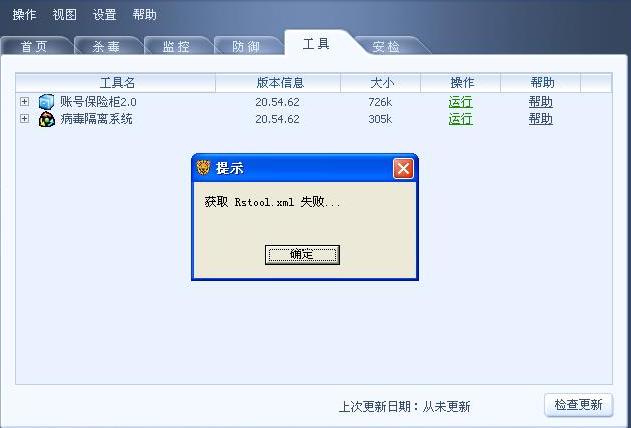 所有客户端瑞星打开后,点击工具标签栏,然后点“检查更新”提示如图所示内容。