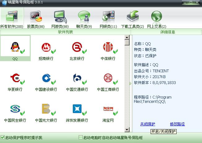 建议楼主打开保险柜,之后看qq上面是否勾选,同时右侧显示内容,显示开启保护,说明未选择;若显示关闭保护,则说明已经保护上了,如下图: