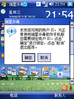 我的手机是夏新N810,打开瑞星杀毒提示说(未发现可用的用户ID,为正常使用瑞星杀毒软件手机版您需要绑定用户ID,点击确定进行绑定,点击取消退出程序),