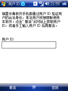 弹出页面:(瑞星杀毒软件手机版通过用户ID验证用户的合法身份,非法用户将被限制使用本软件,