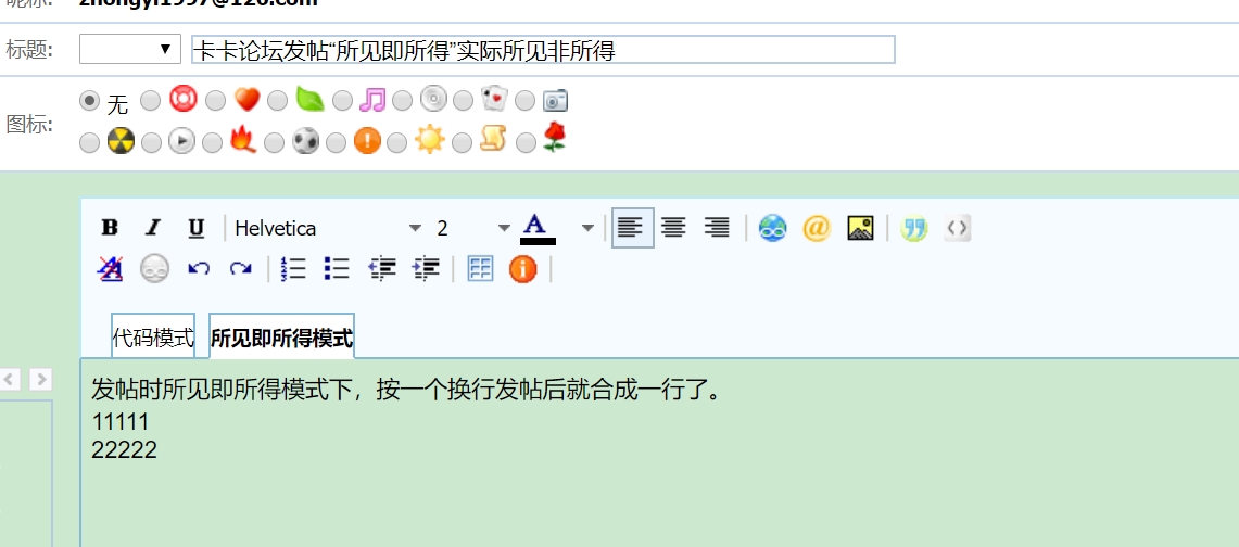 发帖时所见即所得模式下,按一个换行发帖后就合成一行了。