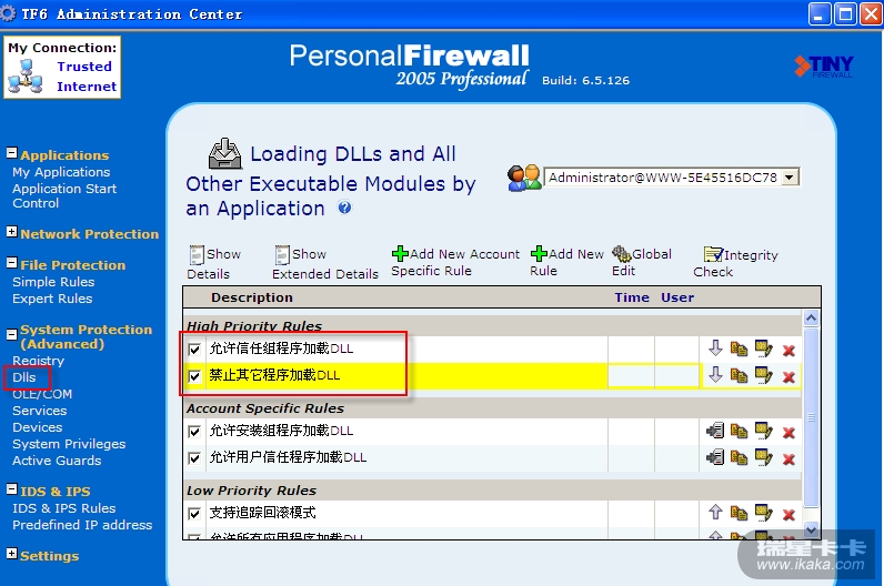 ----对trusted成员,对加载基本的dll们一律允许并不记载,其他的一律提问并记载。规则在非系统帐户下运行。