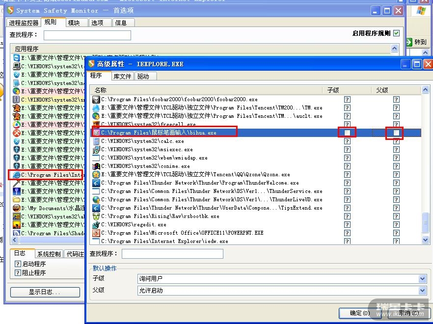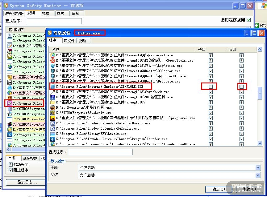 比如QQ伴侣打开后会自动调用浏览器(世界之窗),已经把QQ伴侣设置为父进程,然后禁止了浏览器.可还是会自动调用.是不是还要设置命令行才行?
