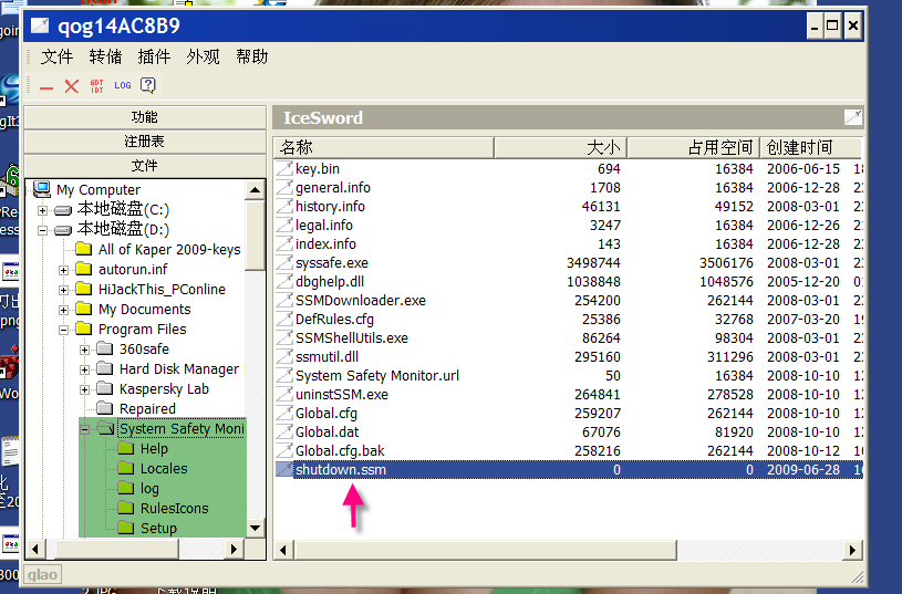 我想知道的是:1,你们的tiny也有这个文件么?  2,它的功用及运作机理?从tiny观察看,光顾它的程序也就是tiny的,卡巴的某些例行的"巡视"程序,加上"系统"("system"),而ssm的开机加载似乎都是"system"进行的,而每次由"system"调动这个shutdown.ssm而关掉SSM似乎也顺理成章,只是在什么条件下才出现这种情况?是系统不能访问那个破解的键值而引起的吗?