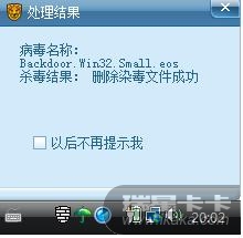 本人的电脑中了一种病毒 瑞星报警是:backdoor.win32.small.eos 现在防火墙一开机就被强行关闭;修复防火墙也不管用。在安全模式下病毒清理也不干净。开机以后就报警发现并清楚这个病毒。但是第二次开机照旧发现并清除,总之,怎么也杀不干净。用各种专杀,也不管用。请大家帮帮忙。再者,在瑞星防火墙的控制访问里面发现一个sucree.exe的程序,以前没注意,但是一禁止它访问网络,我就上不了网。此程序在c:/windows/sysrem32文件夹里。运行时不是系统进程。附一张图片,大家可以看到,发现病毒,但是同时防火墙时关闭的。