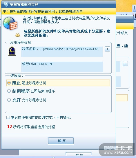 开机后瑞星弹出提示:c:\windows\system32\winlogon.exe c:\autorun.inf 然后D、E F盘都会出现,无法查杀,请问是何原因?