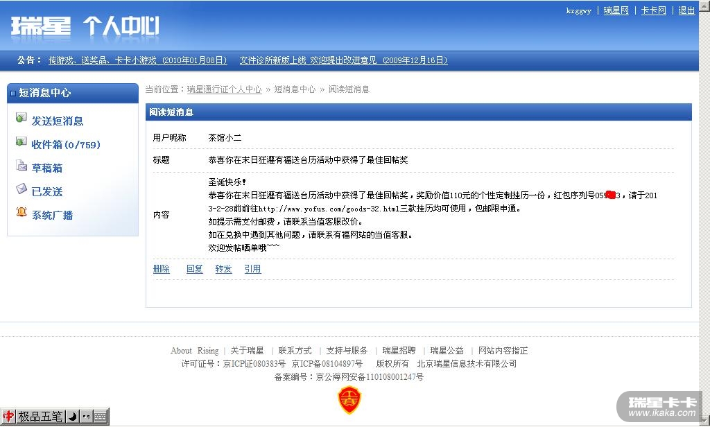 1、2011年2月参加“新春送礼,福兔踢楼”活动中,获得了200楼的奖励:瑞星全功能安全软件(RIS)一年版序列号一个