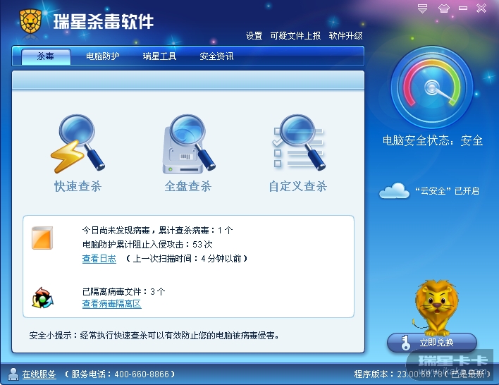 13年来看着瑞星从杀毒软件、防火墙、卡卡助手。。。从千禧版到免费版式,瑞星日益完善、日趋强大。。。这就是品牌的力量。。。。相信瑞星走的更远、走的更好。。瑞星明天更美好。