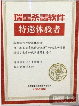 从05年的时候就开始用瑞星了,到现在还在继续用着,用下来感觉不错,后来参加过很多瑞星公测活动,记得参加过瑞星08版的一次内测活动 得到了一个霸王狮 08版杀毒软件盒装 奖牌,还有10版的公测